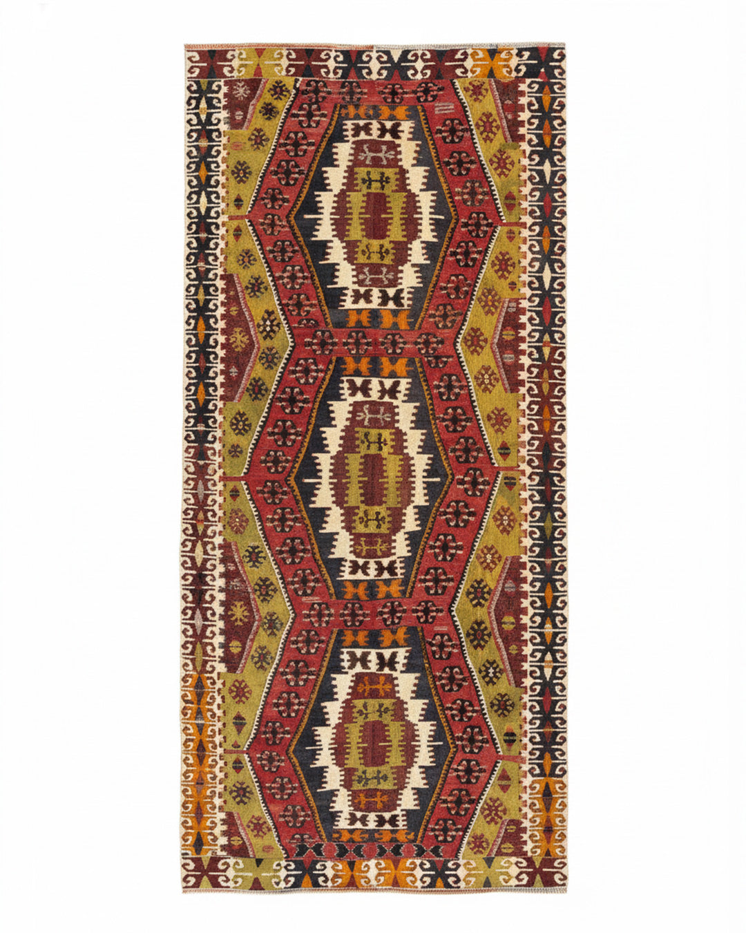 Kilim tribal tejida en lana, de origen turco, semiantigua. Formato rectangular, en el que predomina considerablemente su largo por sobre su ancho. Textura suave.