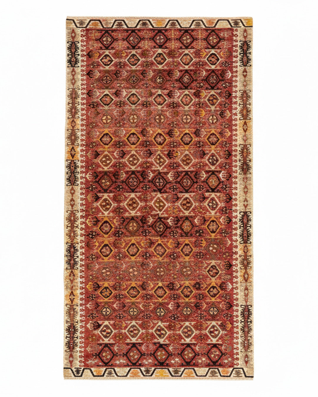 Kilim tribal tejida en lana, de origen turco, semiantigua. Formato rectangular, en el que predomina considerablemente su largo por sobre su ancho. Textura suave.