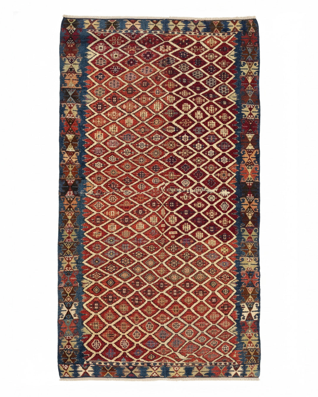 Kilim tribal tejida en lana, de origen turco, semiantigua. Formato rectangular, en el que predomina considerablemente su largo por sobre su ancho. Textura suave.