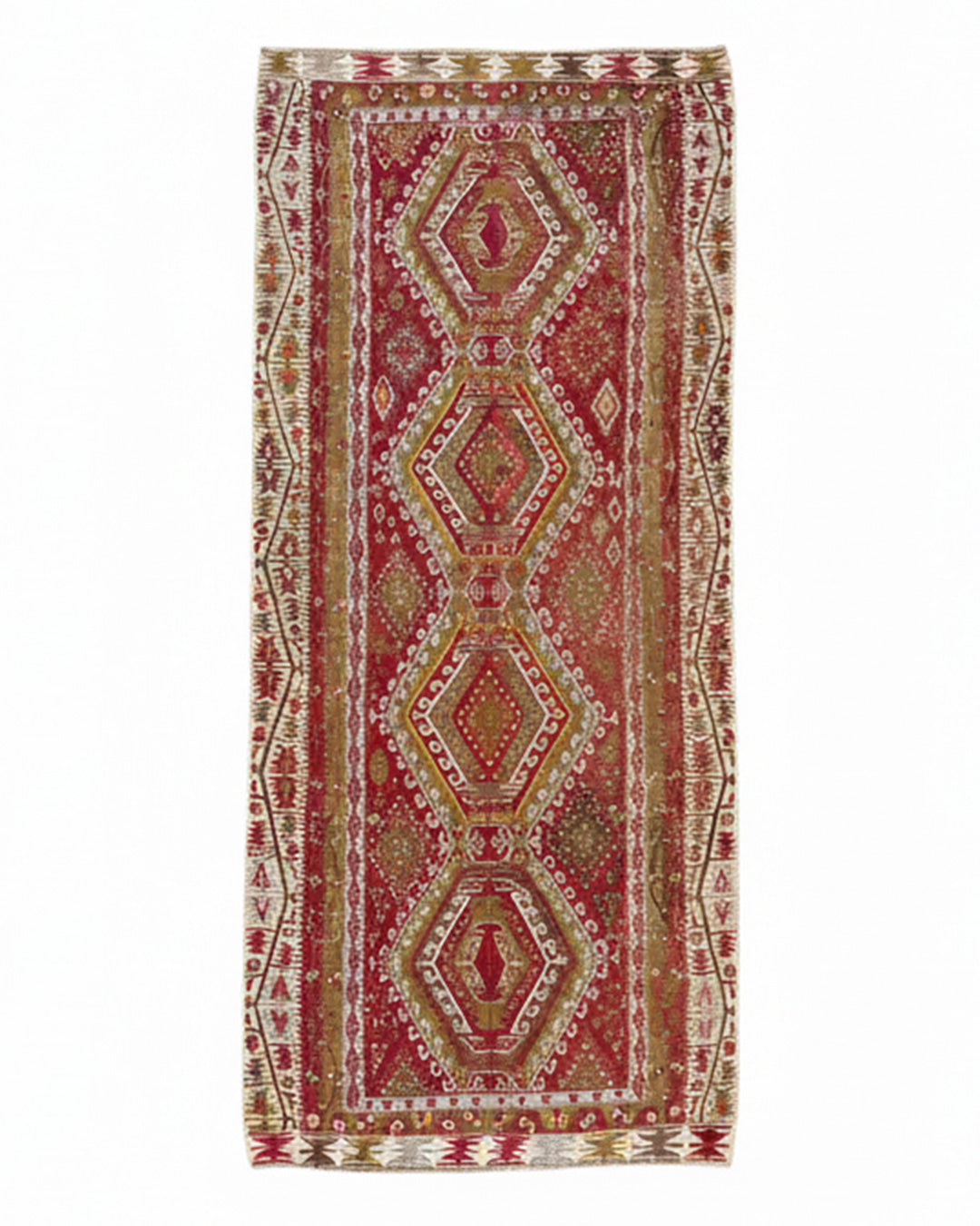 Kilim tribal tejida en lana, de origen turco, semiantigua. Formato rectangular, en el que predomina considerablemente su largo por sobre su ancho. Textura suave.