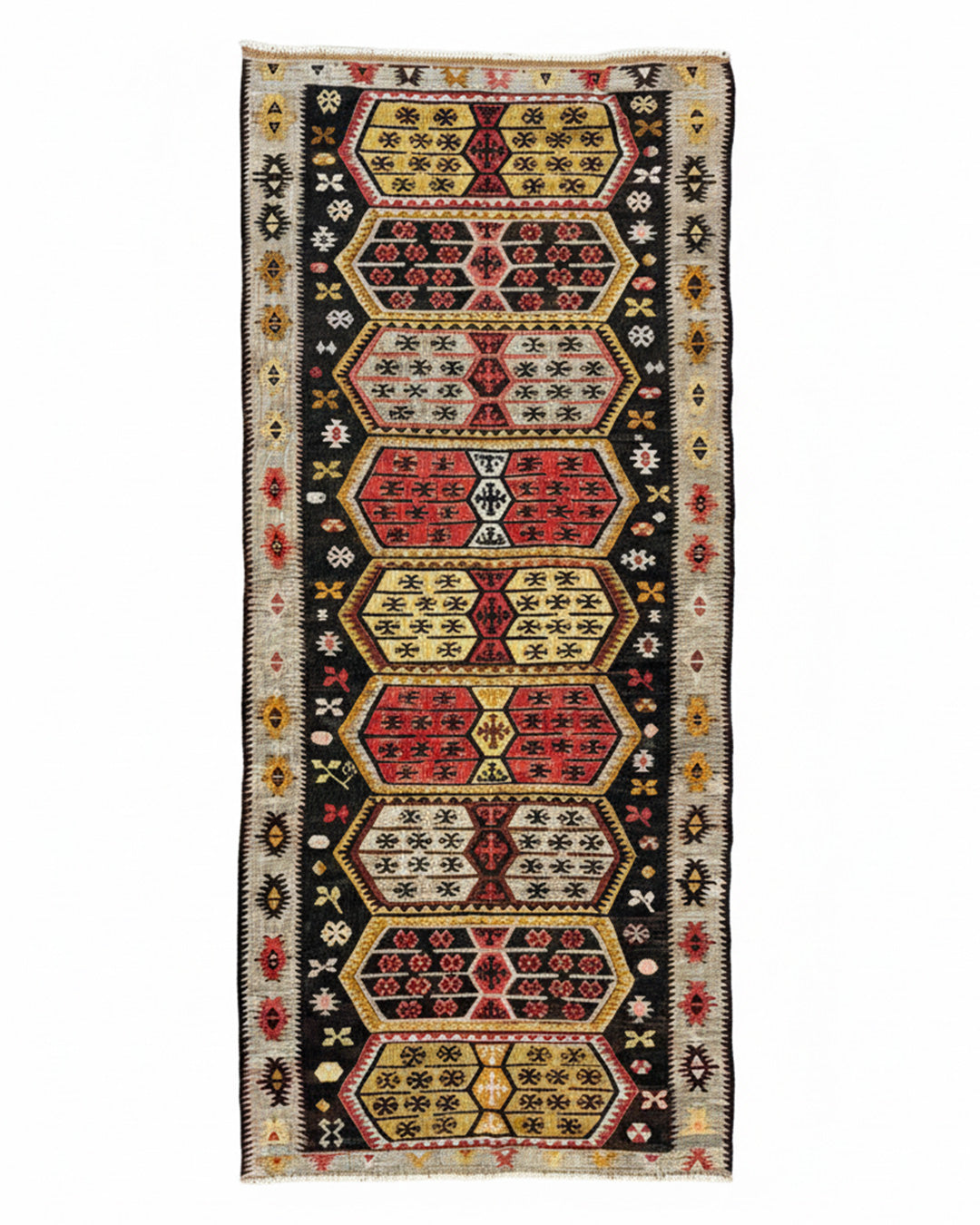 Kilim tribal tejida en lana, de origen turco, semiantigua. Formato rectangular, en el que predomina considerablemente su largo por sobre su ancho. Textura suave.