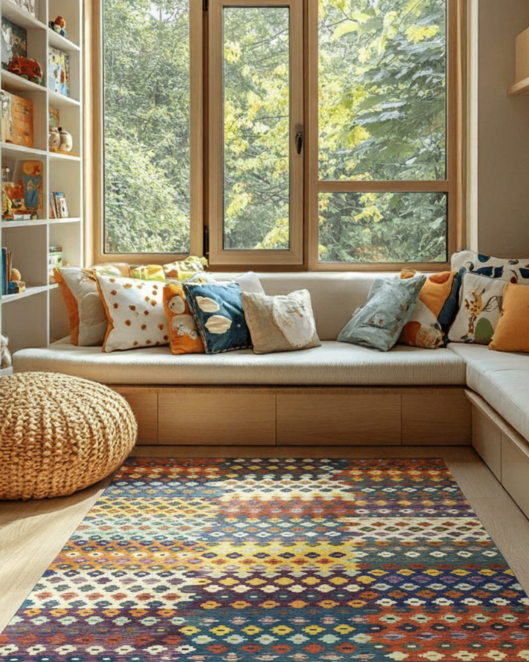 Alfombra de lana, de tejido plano, confeccionada a mano en Pakistán. Se caracteriza por su textura suave, su colorido alegre, y por sus diseños geométricos y tribales.
